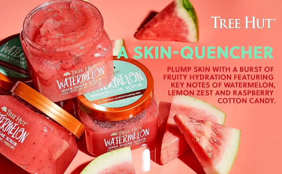 Tree Hut Watermelon Shea Sugar Scrub é um esfoliante corporal à base de açúcar com Melancia, uma experiência refrescante para sua pele com puro prazer sensorial, removendo suavemente as células mortas.