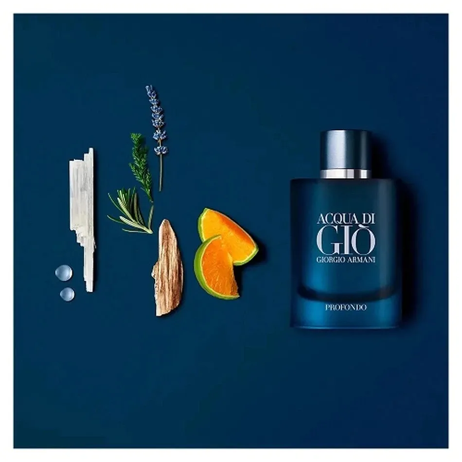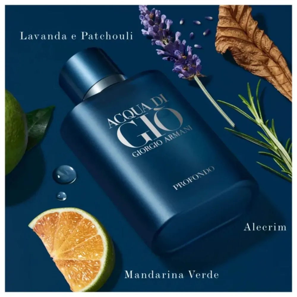 Acqua Di Giò Profondo é um perfume Aquático Aromático Masculino, é a nova e intensa interpretação marinha de Acqua Di Giò, de Giorgio Armani. Capta a atração viciante e intensa de um mergulho cativante nas profundezas desconhecidas do mar. Transmitindo uma sensação de frescor profundo, a fragrância encapsula a experiência de estar imerso nos mistérios do oceano. Os sentidos são despertados pela mandarina verde e bergamota, enquanto um tom ultramarino e quase gelado é transmitido pelas icônicas notas marinhas de Acqua Di Giò. À medida que as bolhas de oxigênio sobem ao topo, o alecrim, a lavanda, o cipreste e o lentisco se misturam no coração. Exalando um caráter masculino de profundidade e intensidade, notas de patchouli amadeirado e almíscar envolvente finalmente se fundem com o toque salino de um acorde de âmbar mineral na base.