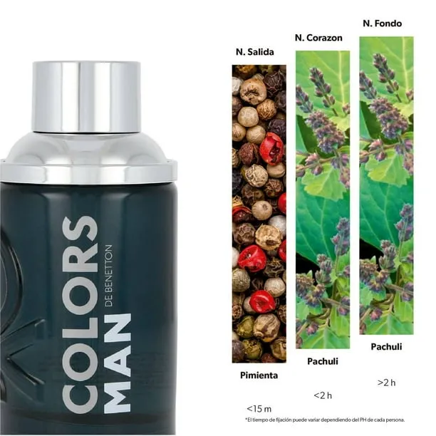 O perfume Colors Man Black Benetton é uma fragrância amadeirada oriental verde com notas de Cítrico verde, Cítrico Apimentado, Amadeirado Oriental, Âmbar e Musk. Compreende uma rica e harmoniosa diversidade de essências desde cítricos refrescantes compensados com especiarias, aromático de madeiras suaves com nuances de âmbar e almíscar.