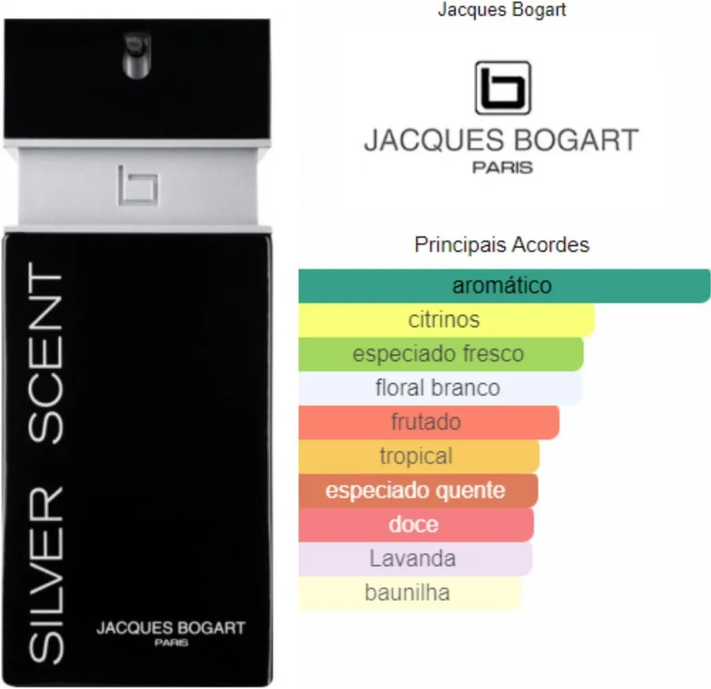 Silver Scent é um perfume Âmbar Amadeirado Masculino, possui uma fragrância mágica e viril, apresenta uma essência de contrastes fresco e quente moderno com uma distinção clássica. Silver representa o lado mágico e misterioso do cinema dos anos 40. Scent representa a fragrância. O homem que usa Silver Scent é determinado, marcante e seguro de si. É atencioso e vaidoso com o que veste e usa, o que o torna extremamente sedutor.