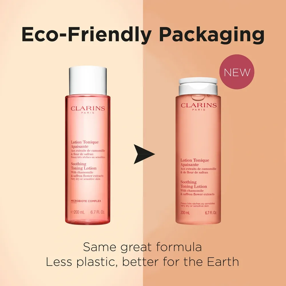 Tônico facial calmante especialmente formulado para a pele muito seca ou sensível. Clarins Soothing Toning Lotion tonifica, hidrata e ajuda a equilibrar a pele.
