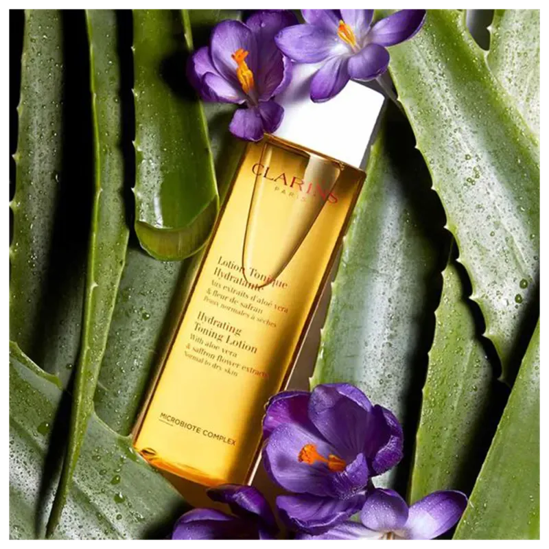 Tônico Facial Hydrating Toning Lotion da Clarins hidrata, equilibra e suaviza a pele normal ou seca, visivelmente, após 14 dias de uso. Este tônico facial refrescante à base de plantas, sem corante e álcool. Enriquecido com Extratos de Aloe Vera e Figo Orgânico, tonifica e hidrata suavemente a pele normal ou seca, deixando-a macia e suave. Formulado para equilibrar a microbiota da pele enquanto remove todos os vestígios de impurezas após o limpador, para uma pele ainda mais saudável, hidratada com um cheiro incrível.